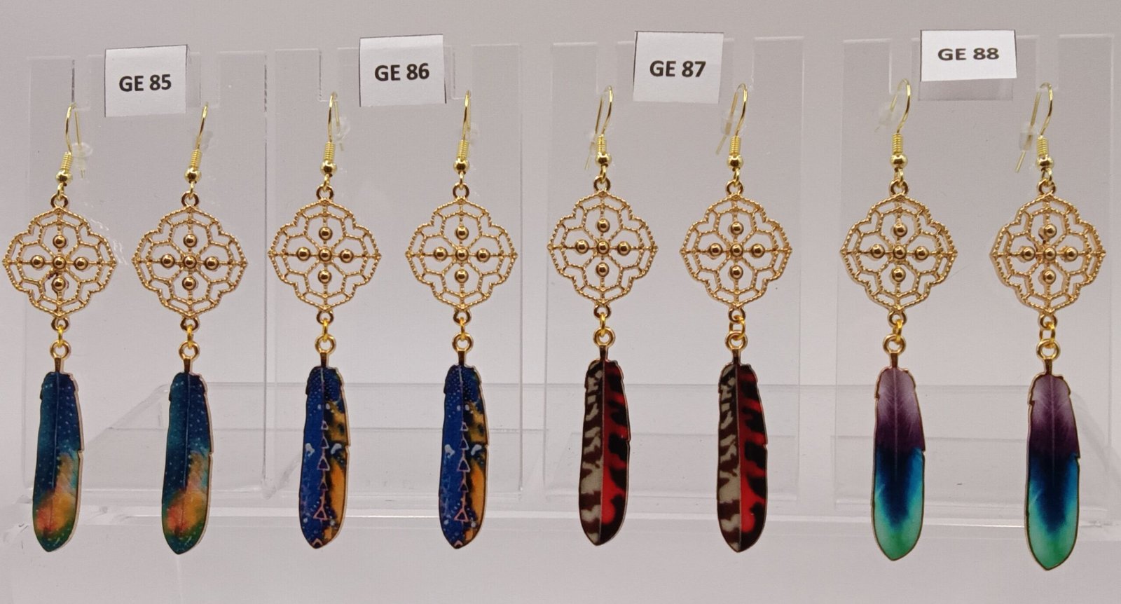 | GE86 | Feather with filigree (blue, orange side by side) | $15 |