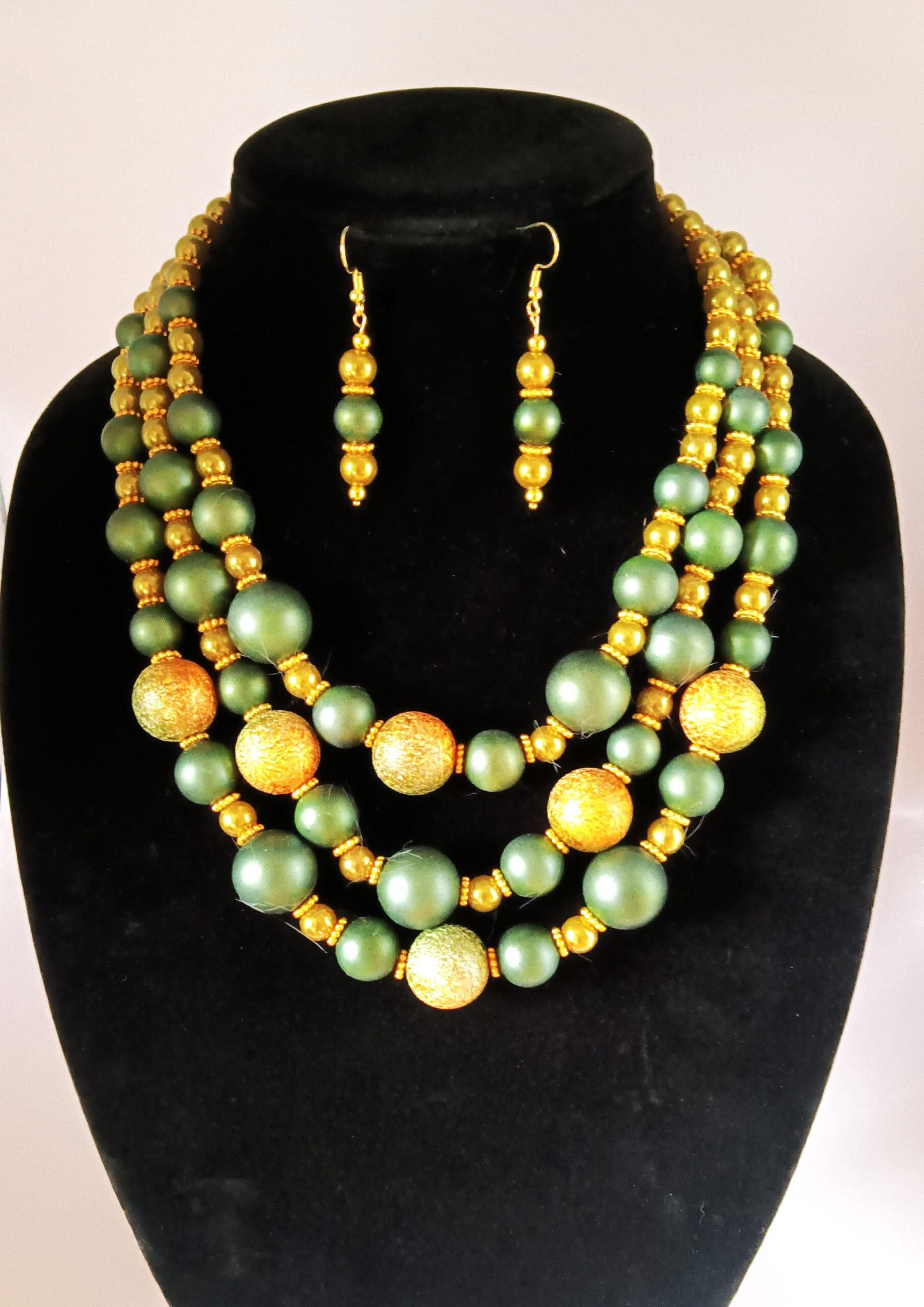 N9 Vintage 1950s SET $80 Repurposed, able to wear 1, 2, or all 3 strands. All plastic replaced by glass beads, golden accents added.